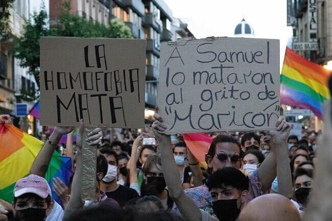 Miles de personas se congregaron para protestar, algunas con la bandera del Orgullo, convocadas por numerosos colectivos LGTB+ (lesbianas, gays, trans, bisexuales y otras diversidades de género), reclamando "Justicia para Samuel", como coreaban los participantes.